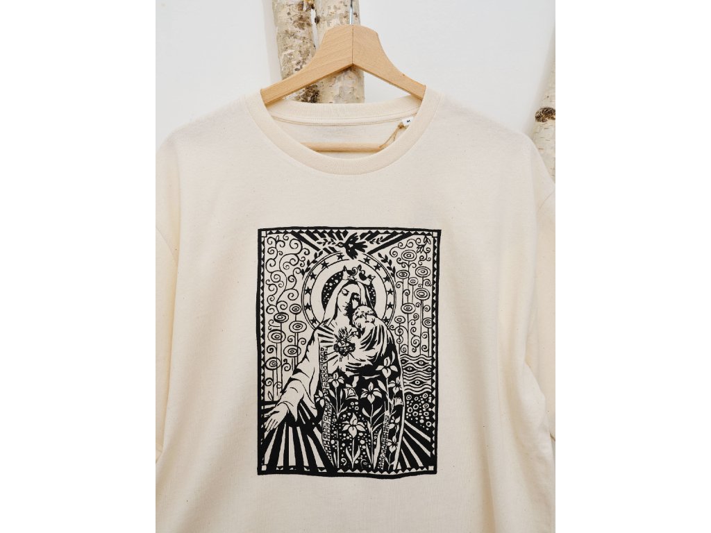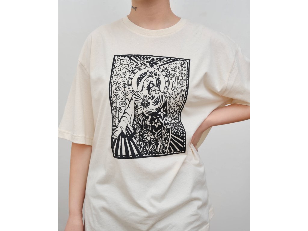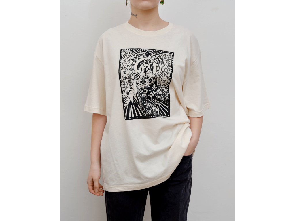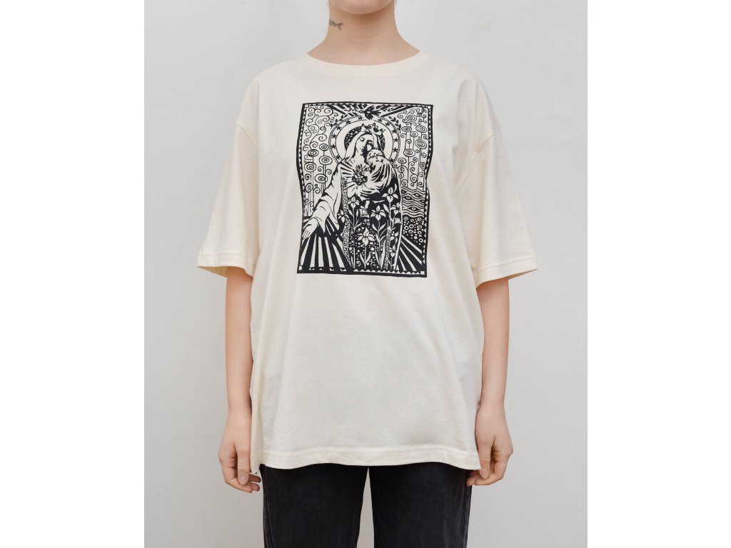 Triko s originální grafikou Madonny, Panny Marie - FlowersTištěno sítotiskemMateriál 100% bavlnaBarva: Off WhiteStřih: Volný, Unisex, Oversize