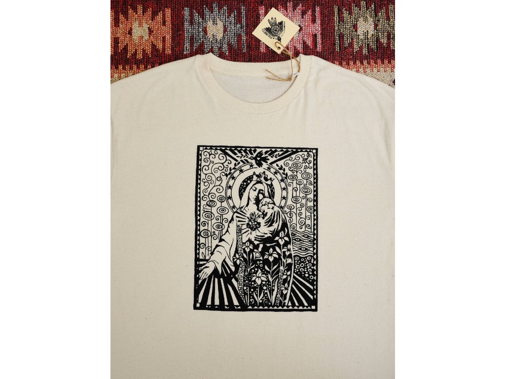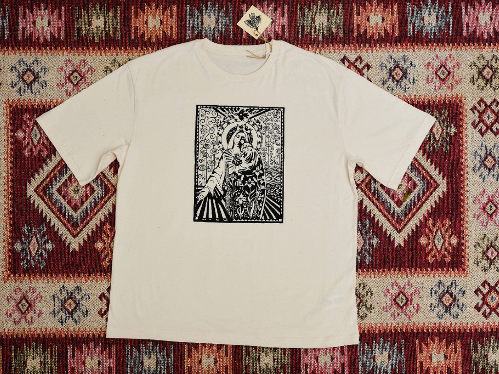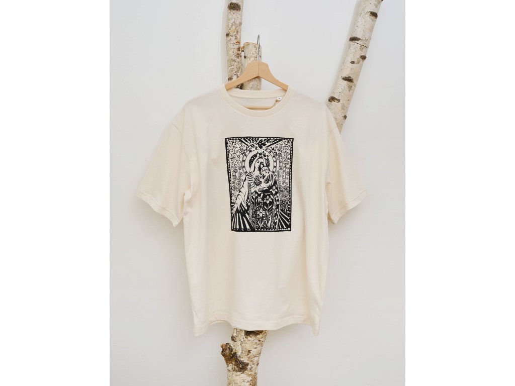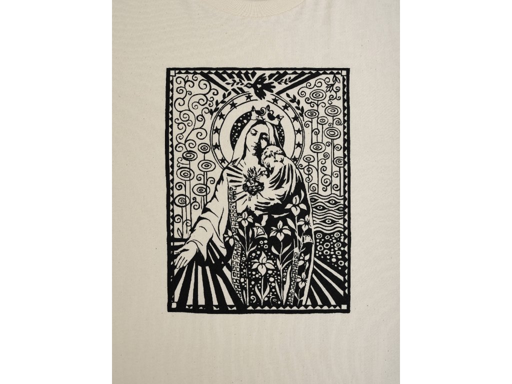 Triko s originální grafikou Madonny, Panny Marie - FlowersTištěno sítotiskemMateriál 100% bavlnaBarva: Off WhiteStřih: Volný, Unisex, Oversize
